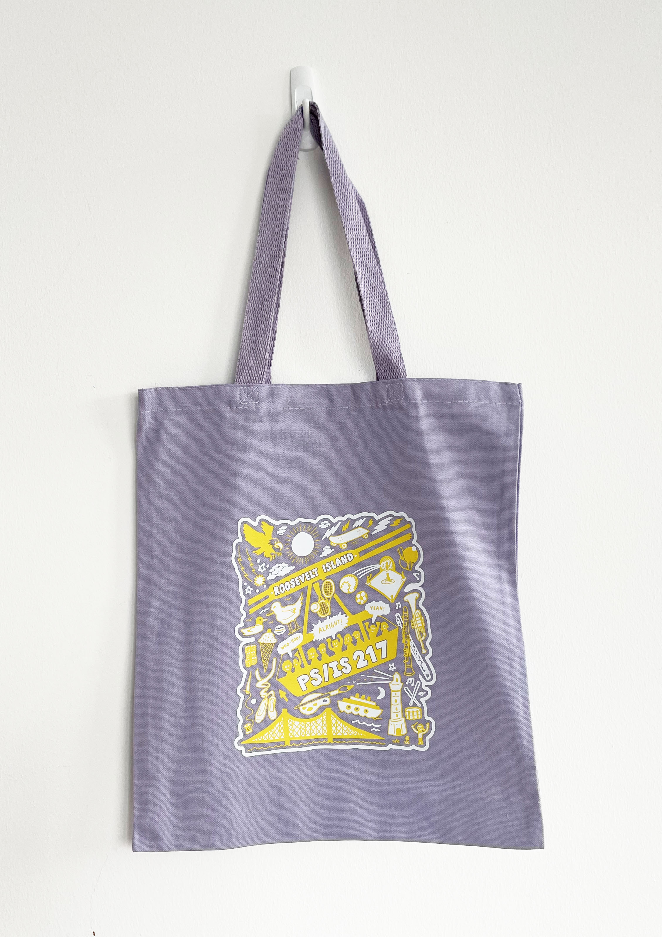 Carry your Hawk pride wherever you go with this PS/IS 217 Spirit Canvas Tote! Featuring the same fun, doodle-style design as our popular School Doodle Tee, this tote showcases iconic Roosevelt Island imagery and school pride in bold white, yellow, and purple.